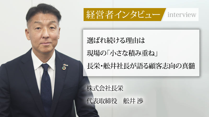 舩井渉/1975年生まれ、大阪府高槻市出身。花園大学社会福祉学部卒業。1997年に新卒採用第一期生として株式会社長栄に入社。主要事業である不動産管理事業を中心に、営業部門の責任者として長年にわたり同社を牽引してきた。管理部長、常務取締役、取締役専務執行役員などを経て、2025年6月に代表取締役に就任。子会社2社の代表取締役を兼任する。趣味は休日の農作業。