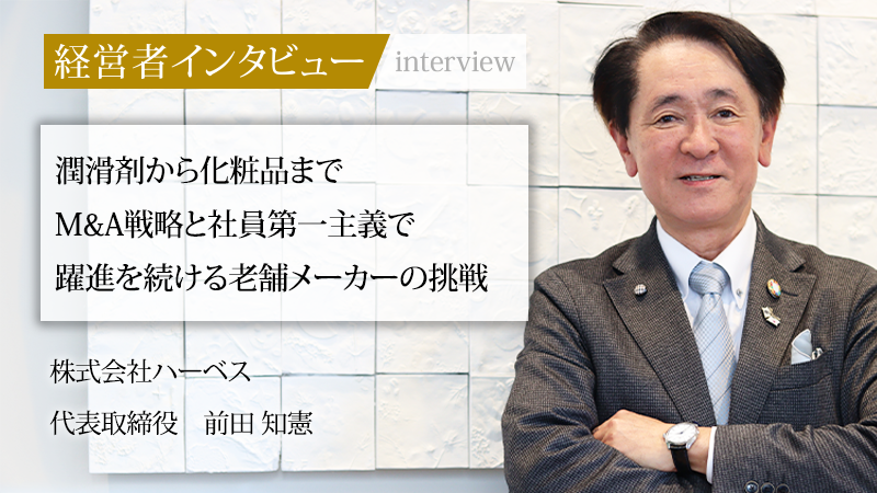 特殊潤滑剤の開発・販売をメイン事業とし、カメラやスマートフォンなど私たちの身近な製品を陰から支える株式会社ハーベス。近年は主力事業にとどまらず、化粧品や天然水など多角的な事業展開とM&Aを積極的に推進している。創業から現在に至るまで、代表取締役の前田知憲氏が貫いてきたのは「謙虚でいる」「当たり前を徹底する」という確固たる信念と「社員第一主義」だ。オフィス1階の空きスペースをカフェのような食堂へと刷新し、食事を無料提供するなど、社員の健康と活躍を何より大切にする姿勢を体現している。今回、前田氏に同社の歩みと未来に向けたビジョンをうかがった。